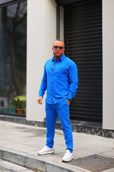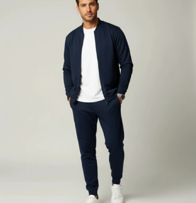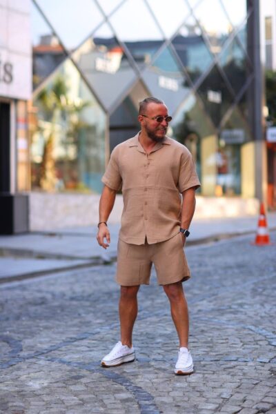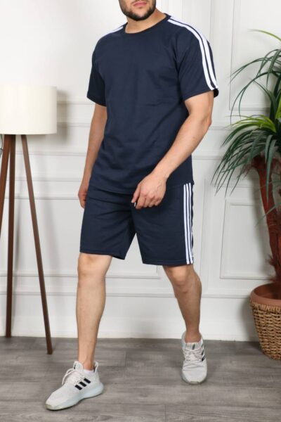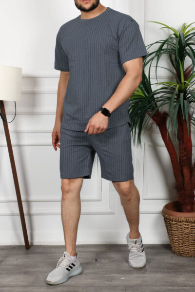 بدلة رجالية باللون الرمادي الداكن مكونة من شورت و تي شيرت بتصميم خطوط بييضاء
